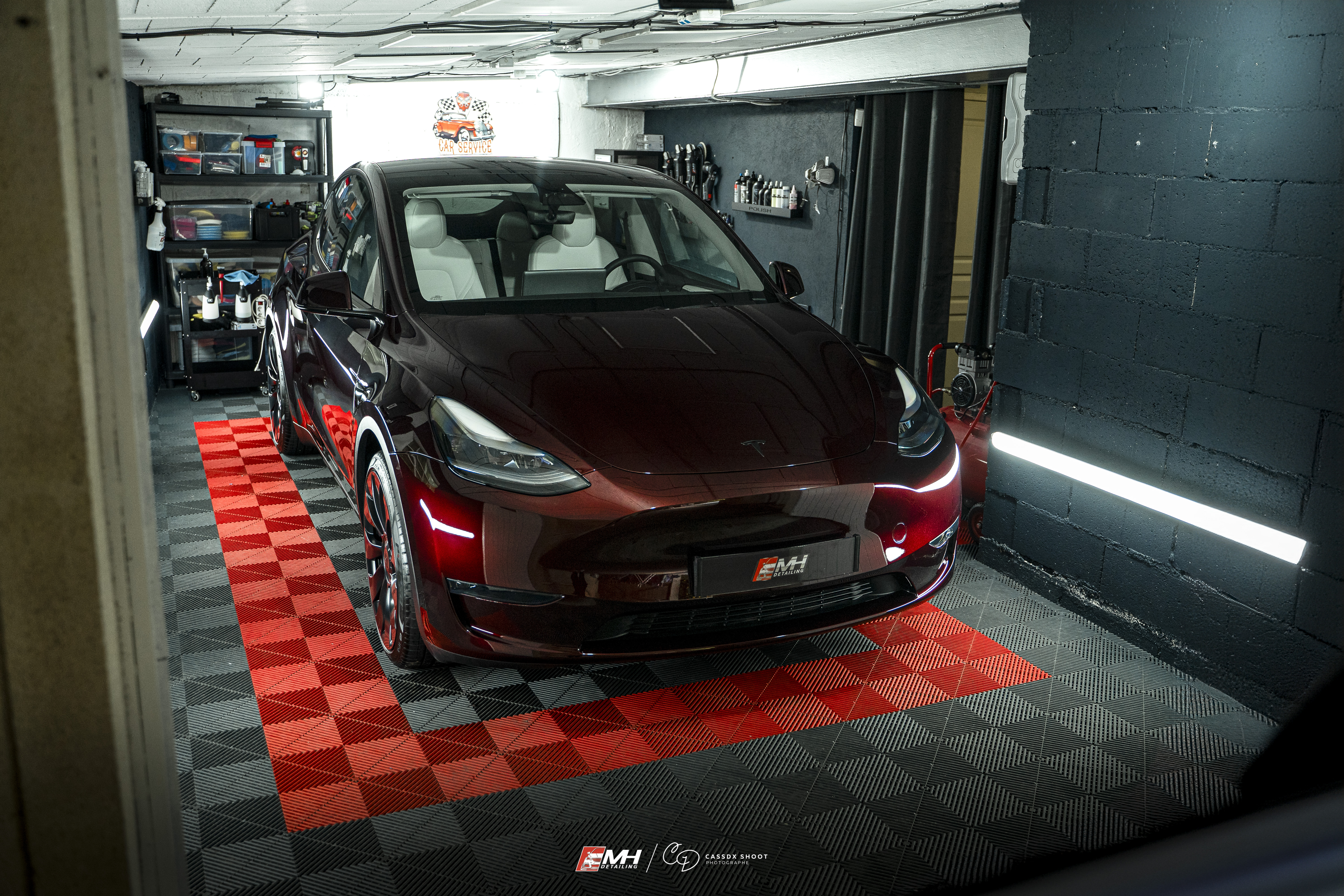 Pose de protection PPF sur Tesla Model Y Performance neuve : préserver la peinture Midnight Cherry Red